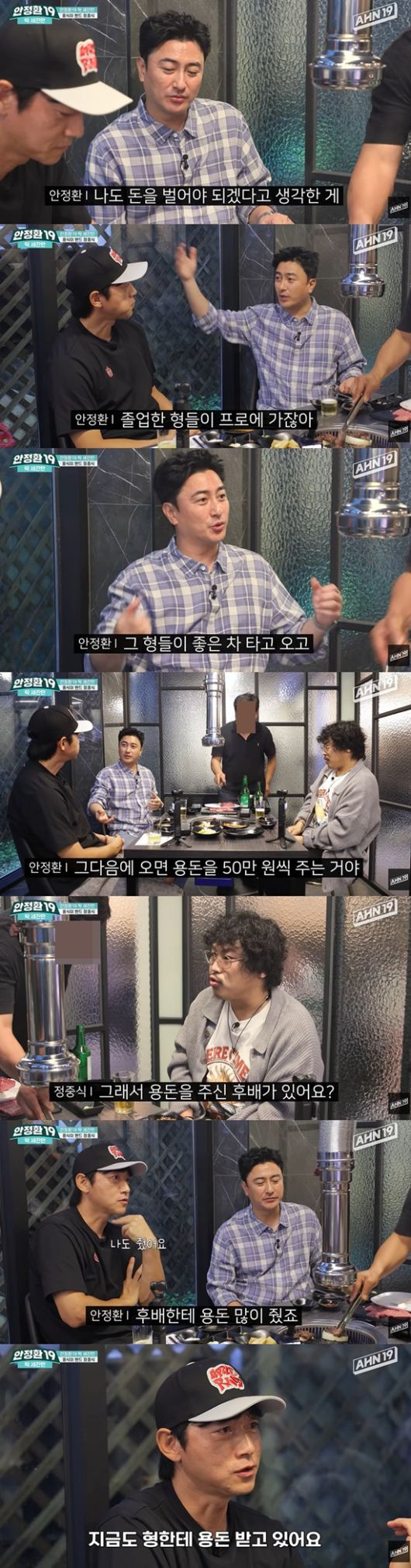 안정환은 "돈을 벌어야 되겠다고 생각한 게 대학교 때였다. 그때는 축구부였다. 대학교 가서 축구하고 있는데 졸업한 형들이 프로에 가지 않냐. 그 형들이 좋은 차 타고 오고, 좋은 옷 입고 오고, 그다음에 오면 용돈을 50만 원씩 주는 거다. 그 당시 50만 원이면 한 달을 먹고 살 수 있다"라고 회상했다.