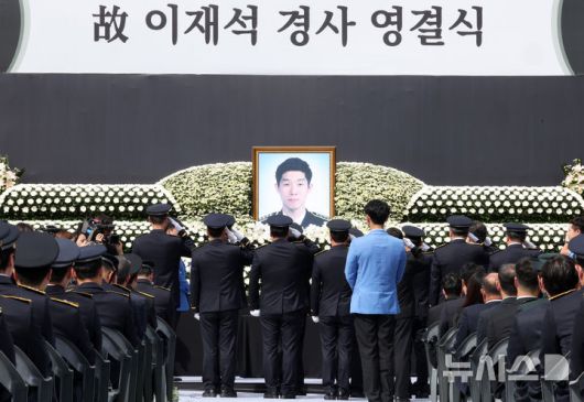 [인천=뉴시스] 전진환 기자 = 갯벌에 고립된 노인을 혼자 구하려다 숨진 고(故) 이재석 경사의 영결식이 진행된 15일 오전 인천 서구 인천해양경찰서에서 오상권 중부해양경찰청장 등 동료들이 헌화 후 경례하고 있다. 2025.09.15. amin2@newsis.com |