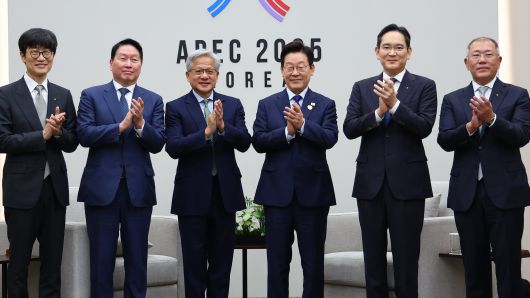 이재명 대통령이 31일 APEC 정상회의장인 경주화백컨벤션센터에서 젠슨 황 엔비디아 최고경영자 접견에 앞서 국내 기업 대표들과 함께 기념촬영을 하고 있다. 왼쪽부터 이해진 네이버 이사회 의장, 최태원 SK그룹 회장, 젠슨 황, 이재명 대통령, 이재용 삼성전자 회장, 정의선 현대차그룹 회장. /연합뉴스 |