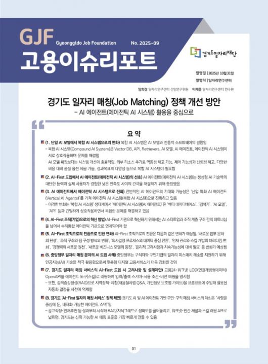 경기도일자리재단이 인공지능(AI)기반 사람 중심의 일자리 연결 체계를 구축하기 위한 정책 보고서 '경기도 일자리 매칭(Job Matching) 정책 개선 방안-AI 에이전트(에이전틱 AI 시스템) 활용을 중심으로'를 발간했다고 31일 밝혔다.
