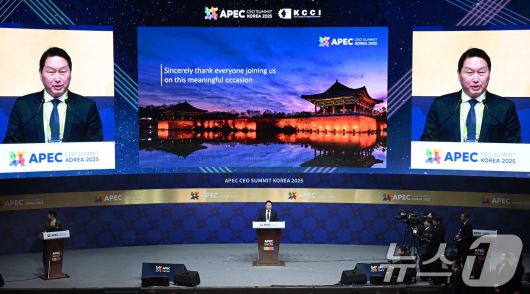 최태원 SK그룹 회장 겸 대한상의 회장이 29일 경북 경주예술의전당에서 열린 아시아태평양경제협력체(APEC) 정상회의 최고경영자(CEO) 서밋(Summit) 개회식에서 개회사를 하고 있다. (공동취재) 2025.10.29/뉴스1 ⓒ News1 김민지 기자 |