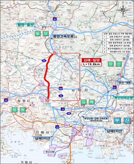 김해~밀양 고속도로는 경남 김해시 진례면~밀양시 상남면 19.8km 구간에 왕복 4차로 고속도로를 신설하는 사업이다. 예타 기준 1조6139억원의 사업비가 책정됐다.