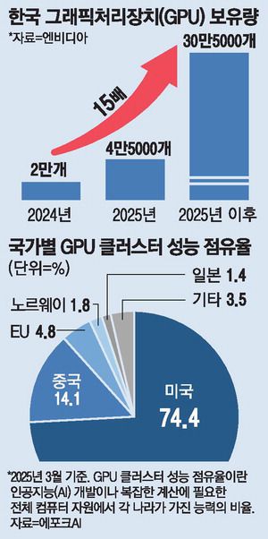 올해 4만5000개를 목표로 하고 있지만 증가 속도에는 한계가 있었다. 이는 미국 빅테크 기업들이 1개 데이터센터에 사용하는 수준에 불과하다. 하지만 이번에 26만개의 GPU가 한번에 공급되면 국내에 설치되는 GPU는 2025년 이후 30만5000개까지 15배 늘어나게 된다.