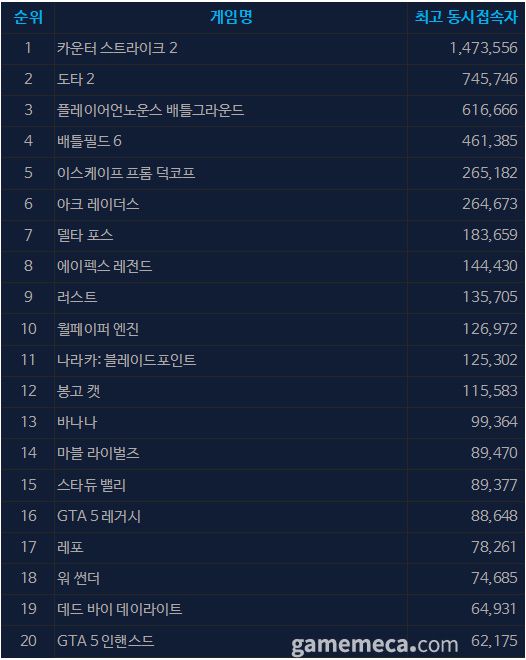 ▲ 10월 31일 오후 5시 기준 스팀 일 최고 동시접속자 TOP 20 (자료출처: 스팀) |