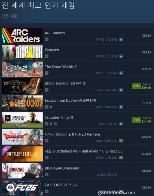 출시를 앞둔 지난 29일부터 스팀 전 세계 최고 인기 게임 1위에 올랐던 엠바크 스튜디오의 아크 레이더스가 출시 직후에도 상승세를 이어가고 있다. 테스트 당시 많은 유저가 몰리며 익스트랙션 슈팅 기대작으로 조명됐는데, 정식 출시 후 스팀 동시접속자 수가 26만 명을 돌파하고 유저 평가도 ‘매우 긍정적’을 기록하며 순조롭게 출발했다.