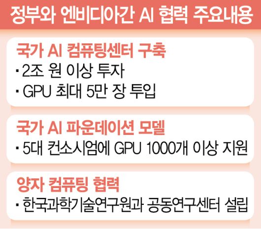 엔비디아는 정부와 삼성·SK·현대차·네이버에 최첨단 GPU 26만 장을 공급하는데 정부가 받을 GPU 5만 장은 ‘국가AI컴퓨팅센터’와 ‘독자 AI 파운데이션 모델’ 사업에 우선 투입된다. 국가AI컴퓨팅센터는 2조 원 이상을 투자해 2030년까지 GPU 최대 5만 장 규모의 초대형 AI 데이터센터를 짓는 ‘한국형 스타게이트’ 사업이다. 최근 사업자 공모에 단독 응찰한 삼성SDS 컨소시엄이 전남 해남군 솔라시도에 데이터센터를 짓는 방안이 유력하다.