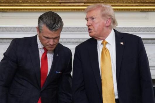 도널드 트럼프(오른쪽) 미국 대통령이 23일 미 워싱턴 백악관 국빈 만찬장에서 열린 범죄 카르텔 관련 라운드테이블 행사가 끝난 뒤 피트 헤그세스 미 국방장관과 대화하고 있다. AP 연합뉴스 |