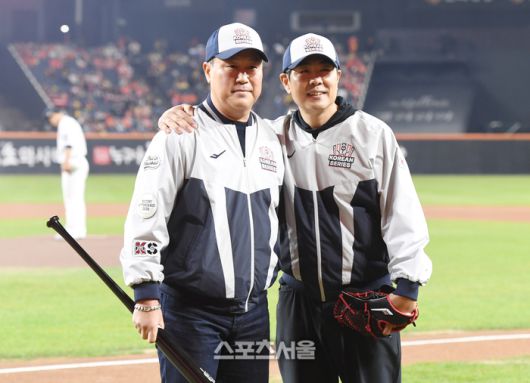 한화 이글스의 레전드 장종훈(왼쪽)과 정민철이 31일 대전 한화생명볼파크에서 열린 2025 KBO리그 LG와 한화의 한국시리즈 5차전에 앞서 시타와 시구를 한 뒤 기념촬영을 하고 있다. 2025. 10. 31.대전 | 박진업 기자 upandup@sportsseoul.com [기사제보 news@sportsseoul.com] Copyright ⓒ 스포츠서울&sportsseoul.com