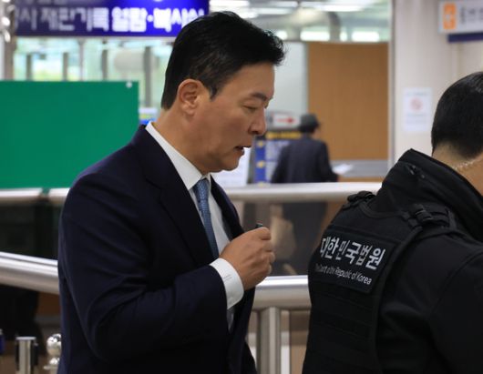 김성훈 전 대통령 경호처 차장이 31일 서초구 서울중앙지법에서 열린 윤석열 전 대통령의 특수공무 집행방해 등 혐의 재판에 증인으로 출석하고 있다. 연합뉴스 |