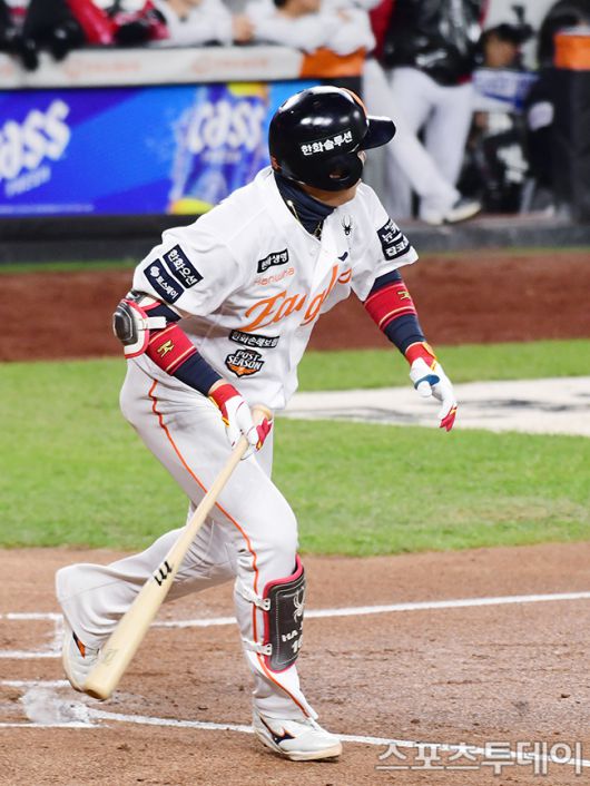 [대전=스포츠투데이 권광일 기자] 2025 신한은행 SOL Bank KBO리그 한국시리즈 5차전 LG트윈스와 한화 이글스의 경기가 31일 대전한화생명 볼파크에서 열렸다. 한화 하주석이 2회말 1사1루에서 2루타를 치고 있다. 2025.10.31. [스포츠투데이 권광일 기자 sports@stoo.com]