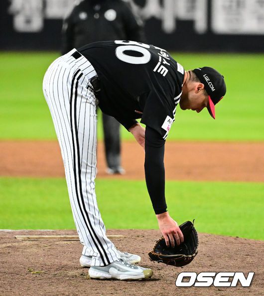 [OSEN=대전, 지형준 기자] 31일 대전 한화생명볼파크에서 2025 신한 SOL Bank KBO리그 포스트시즌 한국시리즈 5차전 한화 이글스와 LG 트윈스의 경기가 열렸다. 이날 경기에 한화는 문동주를, LG는 톨허스트를 선발투수로 내세웠다. 2회말 1사 2,3루에서 LG 톨허스트가 한화 최재훈에 볼넷을 허용하며 아쉬워하고 있다. 2025.10.31 /jpnews@osen.co.kr