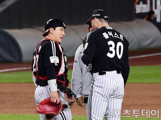 [대전=스포츠투데이 권광일 기자] 2025 신한은행 SOL Bank KBO리그 한국시리즈 5차전 LG트윈스와 한화 이글스의 경기가 31일 대전한화생명 볼파크에서 열렸다. LG 박동원이 3회말 마운드에 올라가 톨허스트와 대화를 나누고 있다. 2025.10.31. [스포츠투데이 권광일 기자 sports@stoo.com]