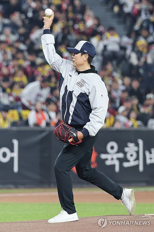 경기 시작 전 한화 1999년 우승멤버인 정민철이 시구하고 있다. 정민철은 1992년부터 2009년까지 한화에서 원클럽맨으로 활약하며 영구결번을 지정받았다. 2025.10.31