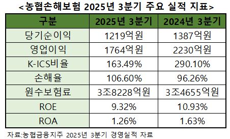 31일 농협금융지주 2025년 3분기 경영실적 발표에 따르면, 올해 3분기 말 기준 농협손해보험 당기순이익은 전년 동기 대비 19.6% 감소한 1219억원을 기록했다. 이는 농업지원사업비 부담 후 당기순이익으로 유효세율 26.4%를 감안해 환산한 수치다.