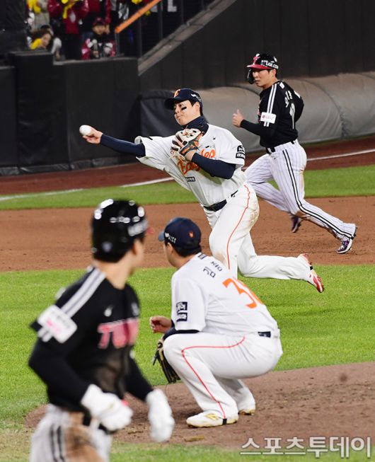 [대전=스포츠투데이 권광일 기자] 2025 신한은행 SOL Bank KBO리그 한국시리즈 5차전 LG트윈스와 한화 이글스의 경기가 31일 대전한화생명 볼파크에서 열렸다. 한화 김종수가 5회초 투수 땅볼을 잡아 송구 하고 있다. 2025.10.31. [스포츠투데이 권광일 기자 sports@stoo.com]