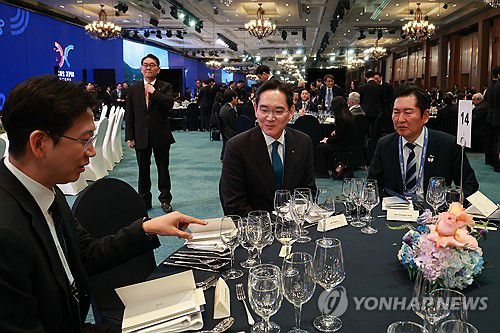 (경주=연합뉴스) 특별취재팀 = 배경훈 산업통상부 장관(왼쪽부터), 이재용 삼성전자 회장, 더불어민주당 정청래 대표가 31일 경북 경주시 라한셀렉트호텔에서 열린 2025 아시아태평양경제협력체(APEC) 정상회의 갈라만찬에 참석해 대화를 나누고 있다. 2025.10.31