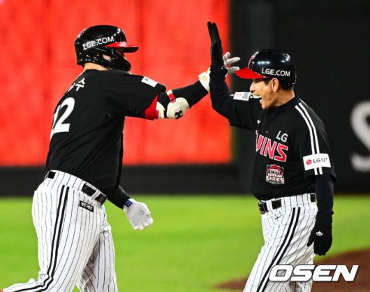 [OSEN=대전, 지형준 기자] 31일 대전 한화생명볼파크에서 2025 신한 SOL Bank KBO리그 포스트시즌 한국시리즈 5차전 한화 이글스와 LG 트윈스의 경기가 열렸다. 이날 경기에 한화는 문동주를, LG는 톨허스트를 선발투수로 내세웠다. 6회초 1사 2루에서 LG 김현수가 1타점 좌중간 적시타를 날리며 송지만 코치와기뻐하고 있다. 2025.10.31 /jpnews@osen.co.kr