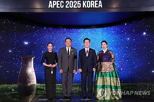 (경주=연합뉴스) 특별취재단 = 이재명 대통령과 김혜경 여사가 31일 경북 경주시 라한셀렉트호텔에서 열린 2025 아시아태평양경제협력체(APEC) 정상회의 갈라만찬 영접장에서 아누틴 찬위라꾼 태국 총리와 티나논 니라밋 부인을 맞이하고 있다. 2025.10.31