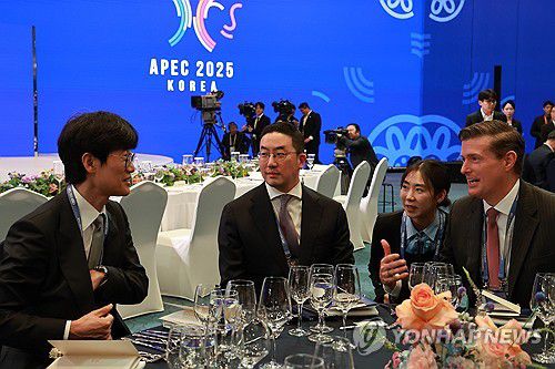 (경주=연합뉴스) 특별취재팀 = 구광모 LG 그룹 회장과 이해진 네이버 이사회 의장이 31일 경북 경주시 라한셀렉트호텔에서 열린 2025 아시아태평양경제협력체(APEC) 정상회의 갈라만찬에서 대화하고 있다. 2025.10.31