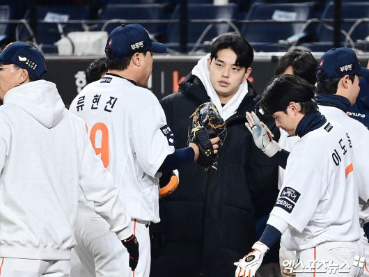 (엑스포츠뉴스 대전, 박지영 기자) 31일 오후 대전한화생명볼파크에서 열린 '2025 신한 SOL Bank KBO 한국시리즈' LG 트윈스와 한화 이글스의 경기, 8회초 종료 후 한화 류현진이 더그아웃으로 향하며 문동주와 하이파이브를 나누고 있다.박지영 기자 jypark@xportsnews.com