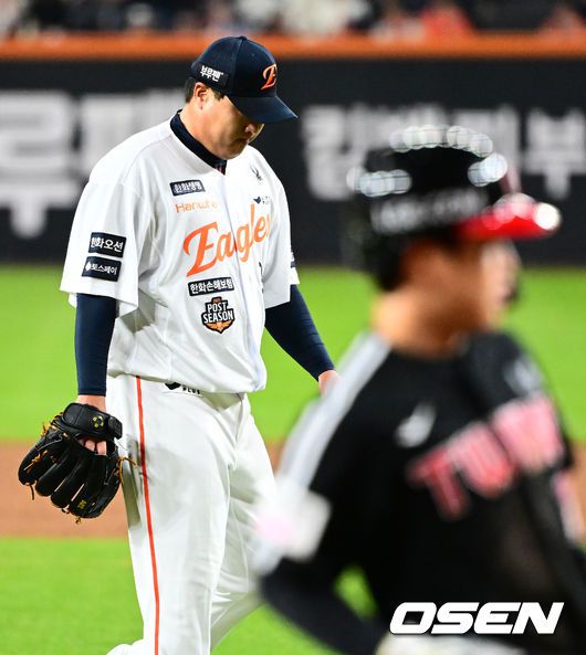[OSEN=대전, 지형준 기자] 31일 대전 한화생명볼파크에서 2025 신한 SOL Bank KBO리그 포스트시즌 한국시리즈 5차전 한화 이글스와 LG 트윈스의 경기가 열렸다. 이날 경기에 한화는 문동주를, LG는 톨허스트를 선발투수로 내세웠다. 9회초 수비에서 1실점을 허용한 한화 류현진이 아쉬워하고 있다. 2025.10.31 /jpnews@osen.co.kr