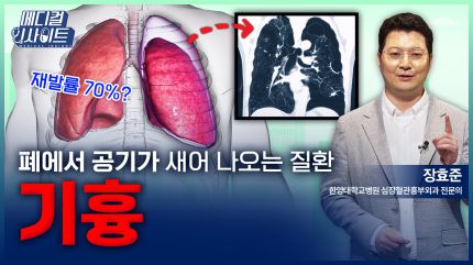 ◆ 장효준 : 그러면 그렇게 증상이 생겼을 때 우리 환자분들이 겪는 가장 흔한 증상은 뭘까요? 이 터지는 그 순간 가슴에 찌르는 듯한 흉통을 느끼게 되고요. 그러면 폐에서 공기가 새기 시작하니까 어떻게 될까요? 마치 고무풍선에서 바람 빠지면 쭈그러들듯이 폐가 이렇게 점점 쭈그러드니까 어떻게 될까요? 우리 폐 기능이 점점 떨어지겠죠. 그래서 숨 쉬는 게 점점 힘들어지고 호흡곤란을 느끼고 숨이 차는 느낌이 생기고요. 흉강 안에 공기가 점점 쌓이게 됩니다. 이렇게 쌓이게 된 공기들은 신경들을 좀 자극을 해서 마른 기침들이 나오는 경우도 있고요. 이런 증상들이 더 지속돼서 심해지는 경우에는 혈압이 떨어져서 어지러움을 느끼거나 아니면 호흡을 너무 못 하게 돼서 입술이 파랗게 질리는 청색증 같은 이런 증상들까지도 심하게 올 수도 있습니다.그런데 간혹 기흉이 있는데도 증상을 전혀 호소하지 않는 환자분들도 계십니다. 제가 외래 진료를 보다 보면은 건강검진 받다가 기흉이 있어서 흉부외과 진료 보라고 하던데요라고 해서 오시는 분들이 있습니다. 실제로 여쭤보면 별로 증상을 호소하지 않아요. 가슴에 통증이나 호흡곤란이나 이런 걸 안 느끼시는데 그러한 이유는 뭐냐 하면 공기가 아주 소량만 샜기 때문입니다. 공기가 많이 새면 당연히 폐가 압박을 받고 호흡곤란 등을 느낄 수 있지만 살짝만 공기가 샜다가 바로 멈춰버리면 환자분들이 별 증상을 느끼지 못하고 지내시는 경우들도 있습니다. 이러한 경우에는 이제 대부분 환자분들이 저절로 호전이 되기 때문에 크게 걱정하실 필요가 없습니다.