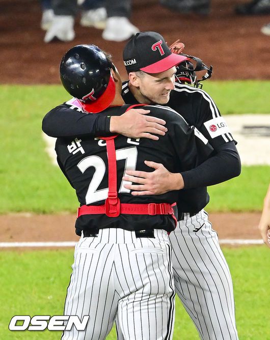 [OSEN=대전, 박준형 기자] 이변은 없었다. 2025시즌 우승팀은 무적 LG 트윈스다. 프로야구 LG 트윈스는 31일 대전 한화생명볼파크에서 열린 2025 신한 SOL뱅크 KBO 한국시리즈(7전 4선승제) 한화 이글스와의 5차전에서 4-1로 승리했다. 통합우승 후 LG 톨허스트와 박동원이 포옹을 하고 있다. 2025.10.31 / soul1014@osen.co.kr