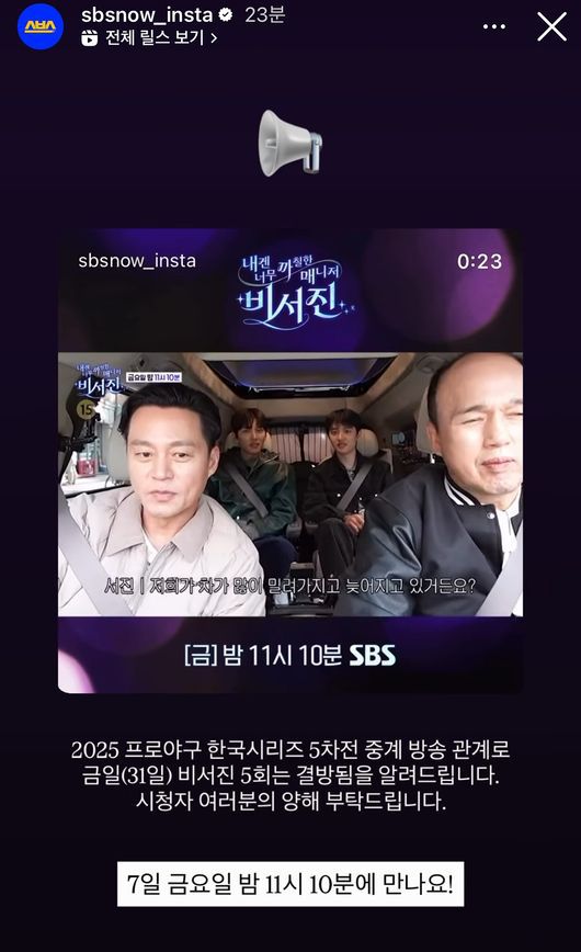 31일인 오늘, SBS 공식 인스타그램을 통해 공개된 안내에 따르면, “2025 프로야구 한국시리즈 5차전 중계 방송 관계로 금일(31일) 비서진 5회는 결방됨을 알려드립니다. 시청자 여러분의 양해 부탁드립니다.”며 안내 공지를 올렸다.