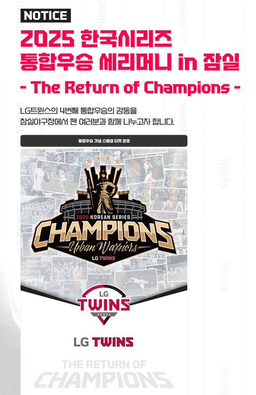 LG는 "이 슬로건에는 2023년 통합우승 이후 다시 정상에 오른 LG의 자부심과 챔피언의 위상, 그리고 새로운 역사를 써 내려가겠다는 의지가 담겨 있다. 'The Return of Champions'는 단순한 승리의 표현을 넘어, 오랜 시간 팬들과 함께 이뤄낸 결실의 의미를 강조한다. 치열한 경쟁 속에서도 흔들림 없이 걸어온 LG의 저력과 투지를 드러내며, 이번 우승이 우연이 아닌 팀과 팬이 함께 만들어낸 필연의 결과임을 상징한다. 또한 '돌아온 챔피언'이라는 선언을 통해, LG가 단발적인 성공을 넘어 지속 가능한 강팀으로 자리매김했음을 의미한다"고 전했다.