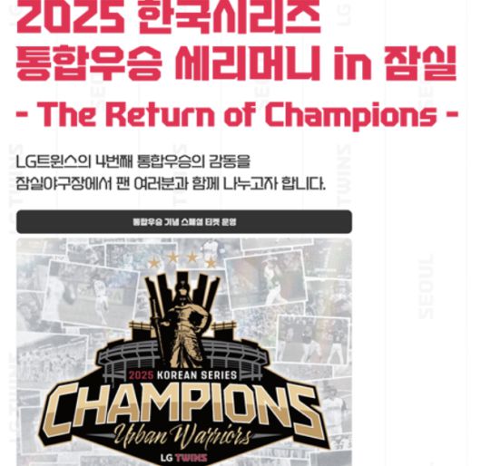 경기 후 LG 구단 관계자는 "LG는 이번 통합우승을 원정 경기에서 달성함에 따라, 그 감동을 팬들과 함께 나누기 위해 잠실야구장에서 '한국시리즈 통합우승 IN 잠실' 행사를 개최한다"고 알렸다.