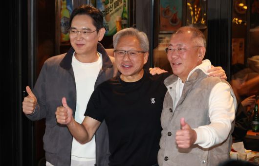 젠슨 황 엔비디아 최고경영자(CEO)와 한국을 대표하는 두 그룹의 수장인 이재용 삼성전자 회장, 정의선 현대차그룹 회장이 30일 서울 강남에서 회동을 가졌다.