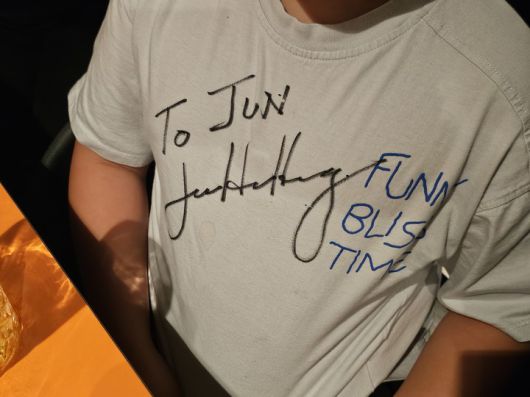 황 CEO는 돌아온 후 한 어린이의 티셔츠에 사인을 해줬고, 결혼식 청첩장을 내민 시민에게도 서명을 남겼다.