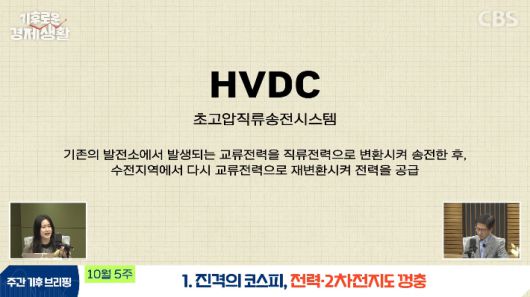 ◆ 홍종호> 네. 전기를 만드는 쪽은 주로 대한민국의 남쪽이죠. 여기서 재생에너지 풍력이나 태양광이 많이 만들어지고 전기를 필요로 하는 곳은 수도권 지역이죠. 산단을 만드는 등으로 인해 전기를 필요로 하는 거죠. 다만 육지로 끌어오려니 주민들의 수용성이 낮아서 바다로 끌어오자는 겁니다. 그러면 거리가 멀어지니 먼 거리에 상대적으로 경제성이 높다고 알려진 HVDC를 깔자고 논의되는 거고요. 약간 전문적인 얘기지만 그 과정에서 DC·AC, 즉 직류와 교류를 바꿔주기 위해 변환소라는 것도 만들어야 합니다. 그래서 여러 가지 인프라 투자가 필요하다는 얘기가 나오는 거죠.