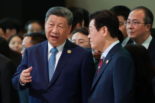 이재명 대통령이 지난달 31일 경북 경주시 라한셀렉트호텔에서 열린 2025 아시아태평양경제협력체(APEC) 정상회의 갈라만찬 영접장에서 시진핑 중국 국가주석과 대화하고 있다. 연합뉴스 |