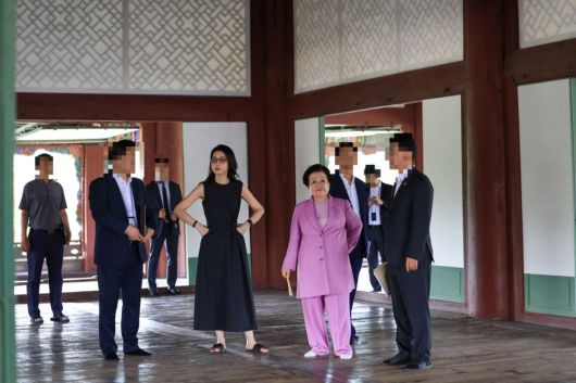 주진우 시사인 편집위원이 양문석 더불어민주당 의원에 제공한 김 여사의 사진. 김건희 여사가 경회루 2층으로 추정되는 한옥 건물에서 이배용 전 국가교육위원장과 함께 내부를 둘러보고 있다. 양문석 의원실 제공 |