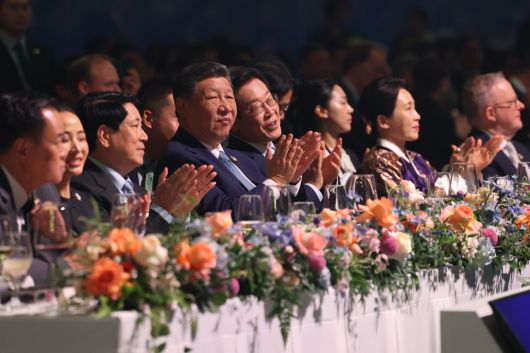 이재명 대통령과 시진핑 중국 국가주석이 31일 경북 경주시 라한셀렉트호텔에서 열린 2025 아시아태평양경제협력체(APEC) 정상회의 환영 만찬에서 문화 공연을 관람하고 있다. |