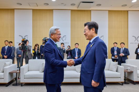 이재명 대통령과 젠슨 황 엔비디아 최고경영자(CEO)가 31일 경북 경주화백컨벤션센터(HICO)에서 면담 하기 전 악수하고 있다. (사진=뉴스1) |