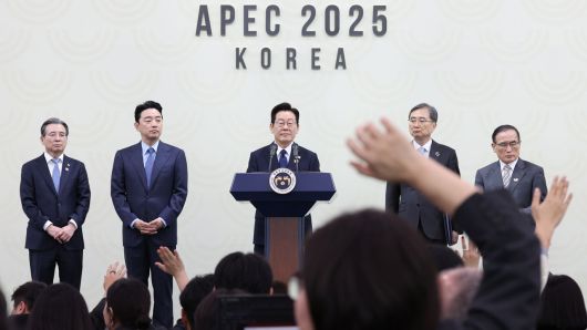 ▲ 이재명 대통령이 1일 경주화백컨벤션센터(HICO)에서 열린 2025 아시아태평양경제협력체(APEC) 정상회의 기자회견에서 질문을 받고 있다.