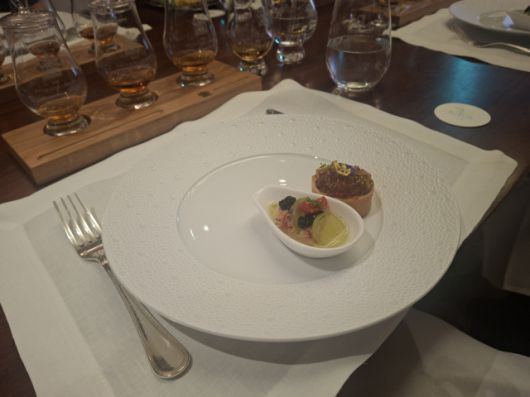 하이라이트는 두 번째 잔이었다. 이날의 주인공이자 가장 도발적인 조합, '글렌피딕 22년 그랑 코르테스'와 '가지를 곁들인 비프 타르타르'가 나왔다. 스페인 팔로 코르타도 셰리 캐스크에서 숙성한 22년산은 그 자체로 말린 과일과 다크 초콜릿의 강렬한 풍미를 뿜어냈다.