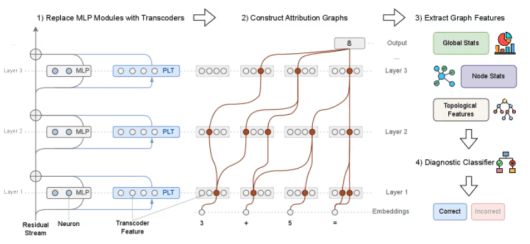 CRV는 LLM 내부의 연산 과정을 '회로 단위(circuit-level)'로 시각화한 계산 그래프를 생성해, 올바른 추론 단계와 잘못된 단계의 구조적 차이를 비교한다. 이를 통해 정확한 추론의 '구조적 지문(structural fingerprint)'을 식별하고, 그 특성을 학습한 분류기를 이용해 오류 발생 여부를 예측한다.