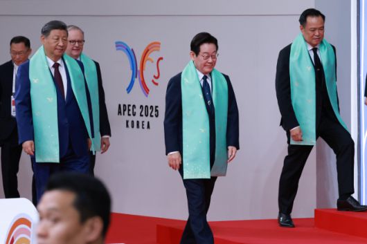 경주 아시아태평양경제협력체(APEC) 정상회의가 1일 폐회 선언을 끝으로 내년 개최국인 시진핑 중국 주석에게 의장직을 인계한 가운데, 각국 정상이 기념 촬영 당시 목에 두른 '옥색 숄(목도리)'이 눈길을 끌었다. 대통령실은 회복·성장·평화를 상징하는 고귀한 색이라고 설명했다.