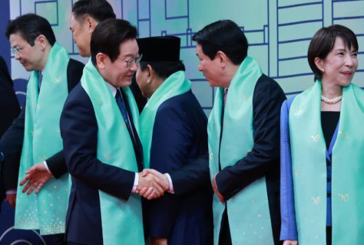 이후 이 대통령을 포함한 시 주석, 다카이치 일본 총리, 스콧 베선트 미국 재무장관 등 21개 APEC 회원국 인사들은 모두 기념 촬영에 나섰다. 이들은 모두 '옥색 숄'을 목에 두른 채, 한국의 전통 기와집을 배경으로 서서 박수를 치며 APEC의 성공적인 폐막을 축하했다.