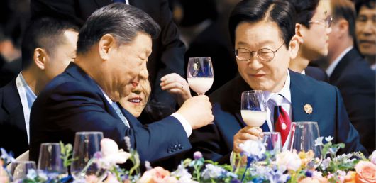 이재명 대통령과 시진핑 중국 국가주석이 31일 경북 경주시 라한셀렉트호텔에서 열린 2025 APEC(아시아태평양경제협력체) 정상회의 만찬에서 건배하고 있다. /연합뉴스 |