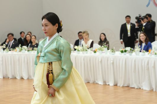 김 여사는 이어 경주 엑스포대공원 문화센터를 찾아 정성숙 국립정동극장 대표, 정구호 감독 등 전통연희극 ‘단심’ 예술단을 격려했다. 전통연희극 ‘단심’은 국립정동극장 개관 30주년을 기념해 제작된 예술단의 신작으로, 다양한 형태로 전승된 ‘심청’ 이야기를 현대적 시각으로 재해석한 작품이다. 36명의 출연진이 한복을 입고 형형색색의 전통 문양을 넣은 스크린에 둘러싸여 역동적인 군무를 선보이며, 이번 정상회의를 찾은 각국 인사와 시민들에게 한복과 한국 전통예술의 품격을 전할 예정이라고 대통령실은 설명했다.