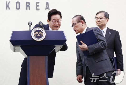 이재명 대통령이 2025 아시아태평양경제협력체(APEC) 정상회의 폐막일인 1일 오후 경북 경주화백컨벤션센터(HICO) 인근 국제미디어센터(IMC)에서 기자회견 도중 위성락 안보실장과 대화하고 있다. 2025.11.1/뉴스1 ⓒ News1 김민지 기자 |