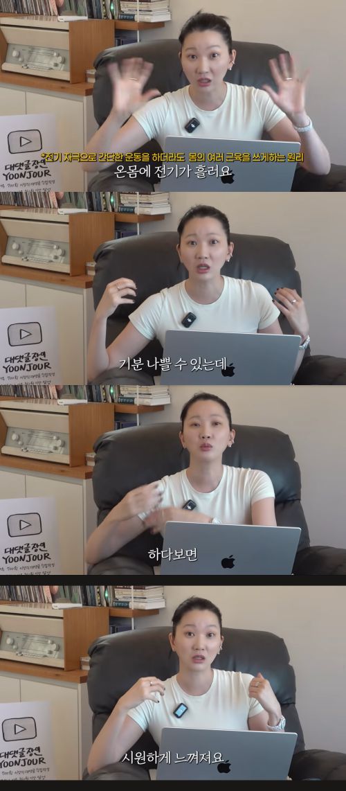 장윤주는 “슈트를 입고 전류를 버티며 운동하는 게 처음에는 낯설고 기분이 이상하지만, 하다 보면 붓기가 빠지고 찌릿찌릿한 자극이 마사지처럼 시원하게 느껴진다”며 “20분 운동으로 웨이트 3~4시간 한 효과를 본다”고 설명했다. 그는 “촬영을 앞두고 빠르게 몸을 만들어야 할 때 효과적이며, 특히 힙 운동에 탁월했다”고 덧붙였다.