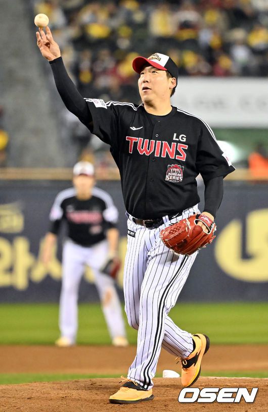 [OSEN=잠실, 민경훈 기자] 1일 오후 서울 잠실야구장에서 LG 트윈스의 한국시리즈 통합우승 IN 잠실' 행사가 열렸다. 팬들을 위한 트로피 퍼포먼스, 선수단 그라운드 행진, 비하인드 스몰토크, 선수단 샴페인 샤워 등 다양한 프로그램이 펼쳐진다. LG 김현수가 통합 우승 기념 이벤트 경기를 하고 있다. 2025.11.01 /rumi@osen.co.kr