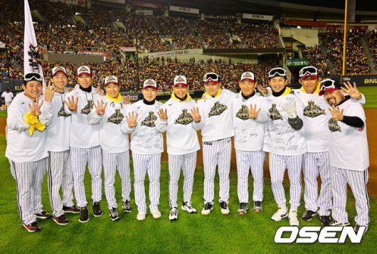 [OSEN=잠실, 민경훈 기자] 1일 오후 서울 잠실야구장에서 LG 트윈스의 한국시리즈 통합우승 IN 잠실' 행사가 열렸다. 팬들을 위한 트로피 퍼포먼스, 선수단 그라운드 행진, 비하인드 스몰토크, 선수단 샴페인 샤워 등 다양한 프로그램이 펼쳐진다. 잠실구장 그라운드 위에서 LG 코치진들이 모여서 사진을 찍고 있다. 2025.11.01 /rumi@osen.co.kr