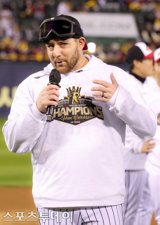 [스포츠투데이 안성후 기자] LG트윈스의 2025 한국시리즈 우승 세리머니가 1일 오후 서울 잠실야구장에서 열렸다. 이날 LG트윈스 오스틴 딘 선수가 인터뷰를 하고 있다. 2025.11.01 [스포츠투데이 안성후 기자 sports@stoo.com]