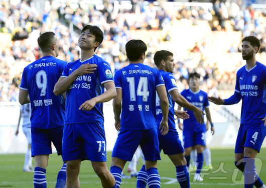 (수원=뉴스1) 박정호 기자 = 1일 오후 경기도 수원시 팔달구 월드컵로 수원월드컵경기장에서 열린 하나은행 K리그2 2025 37라운드 수원삼성과 충북청주의 경기에서 선제골을 넣은 수원 김지현이 세리머니를 하고 있다. 2025.11.1/뉴스1pjh2035@news1.krCopyright ⓒ 뉴스1. All rights reserved. 무단 전재 및 재배포, AI학습 이용 금지.